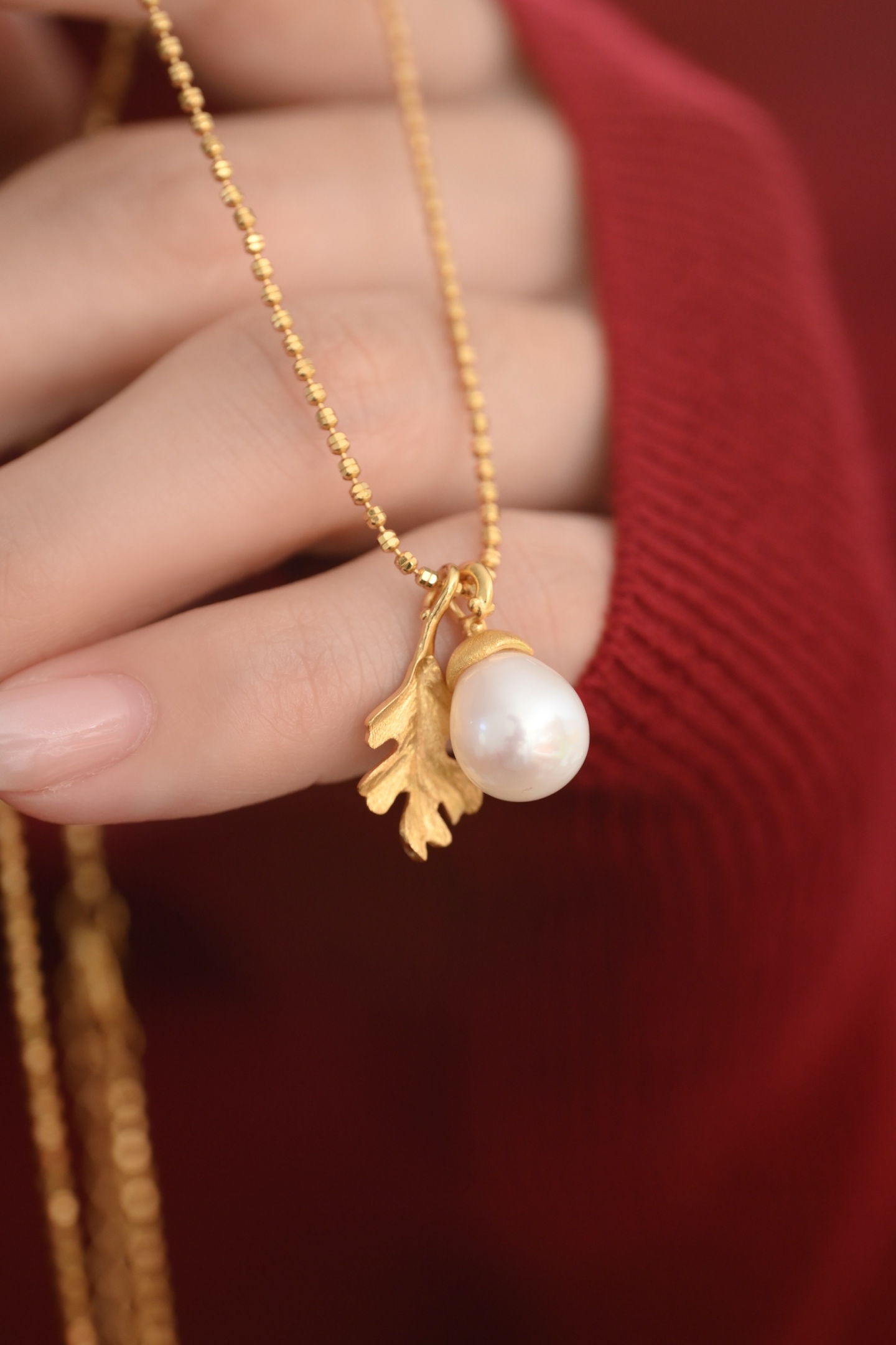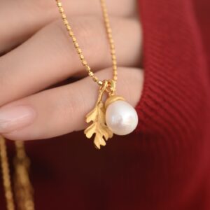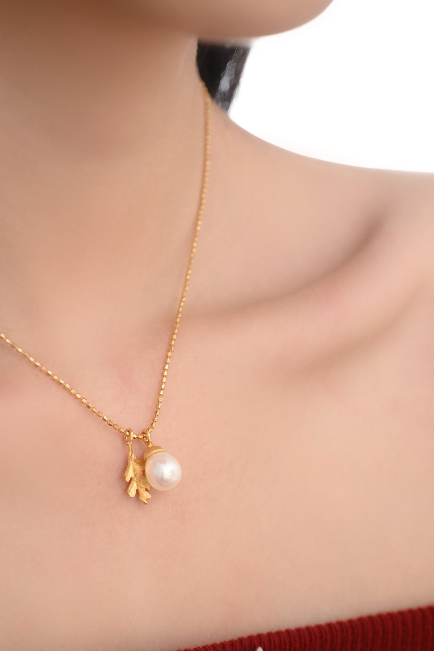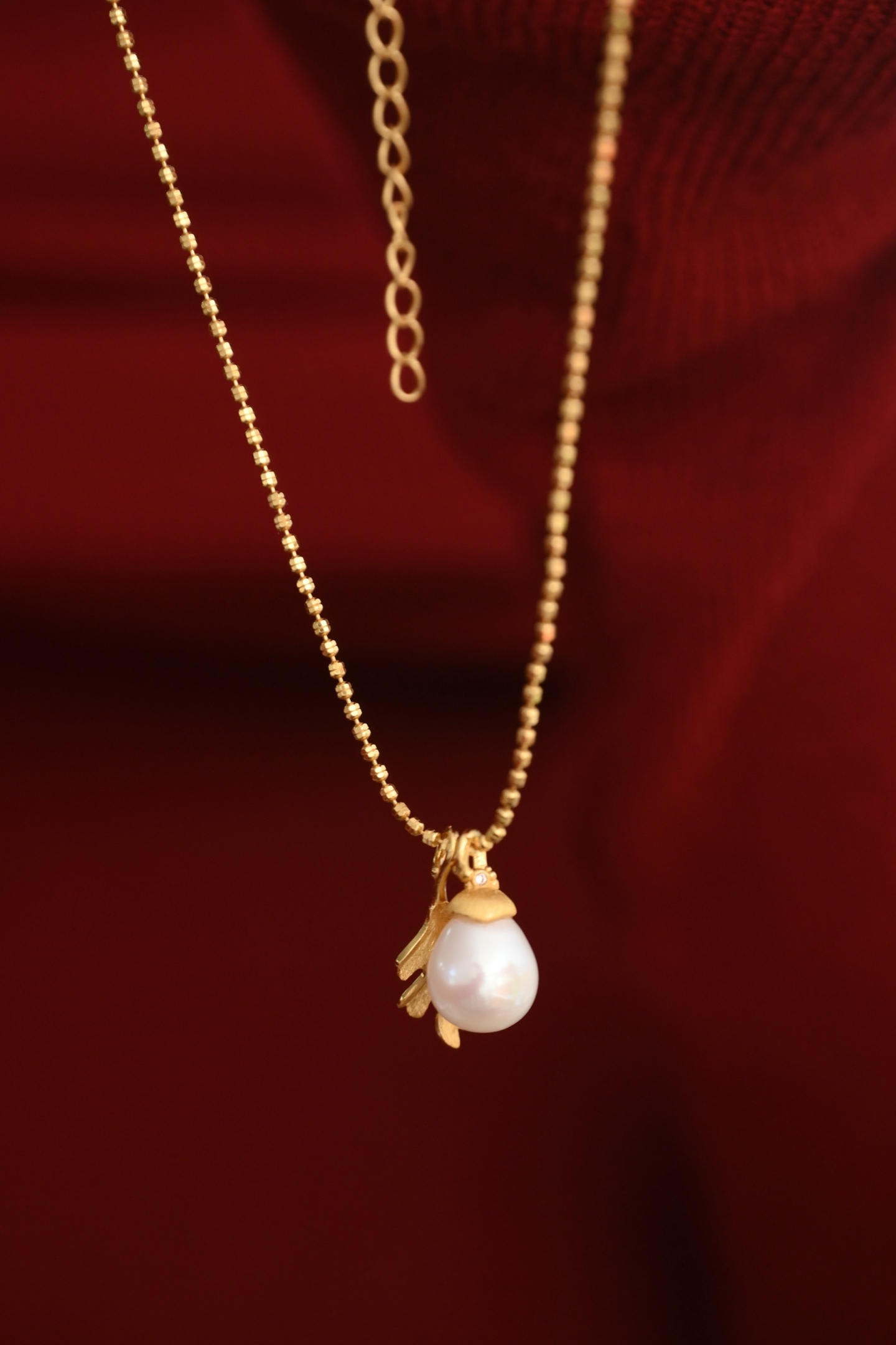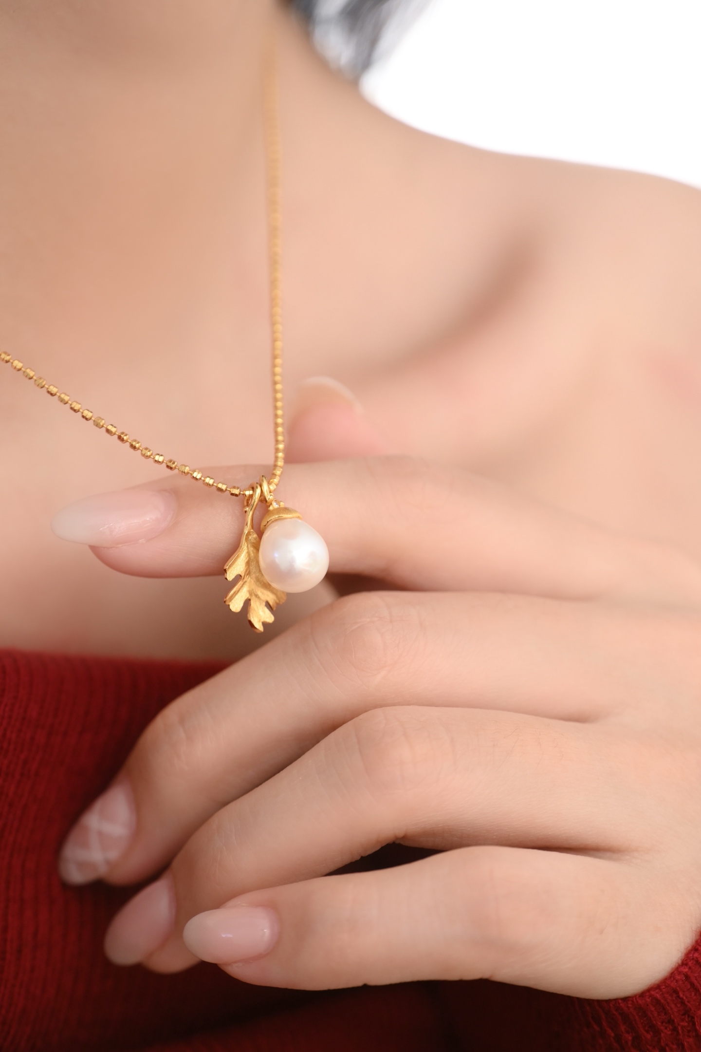 Crafted from **925 sterling silver with a premium gold plating**, the necklace offers a warm glow that complements the season’s palette. The use of a smooth, **natural pearl** adds a touch of organic elegance and soft contrast to the finely detailed metalwork.